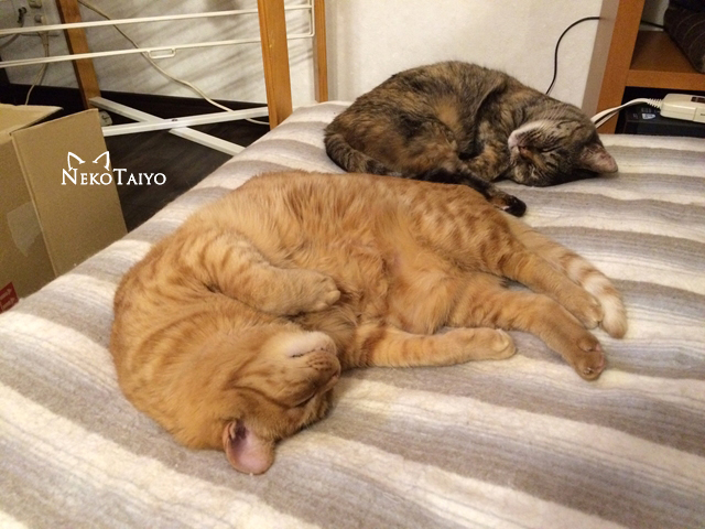 暖房代わり 昨日の天気予報で雪マークが出ていて「ウソ~」と思ってたら、ほんとに雪が舞っていた…そんな寒さなのに、ノイが電気敷毛布の上にゲロったので、洗って、乾くまでの間、ノイは私の膝から離れなかった…完璧に、暖房代わりやね