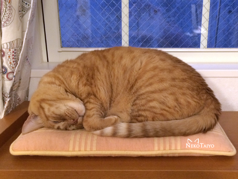 窓辺で、自らをコンパクトに収納して眠るノイです