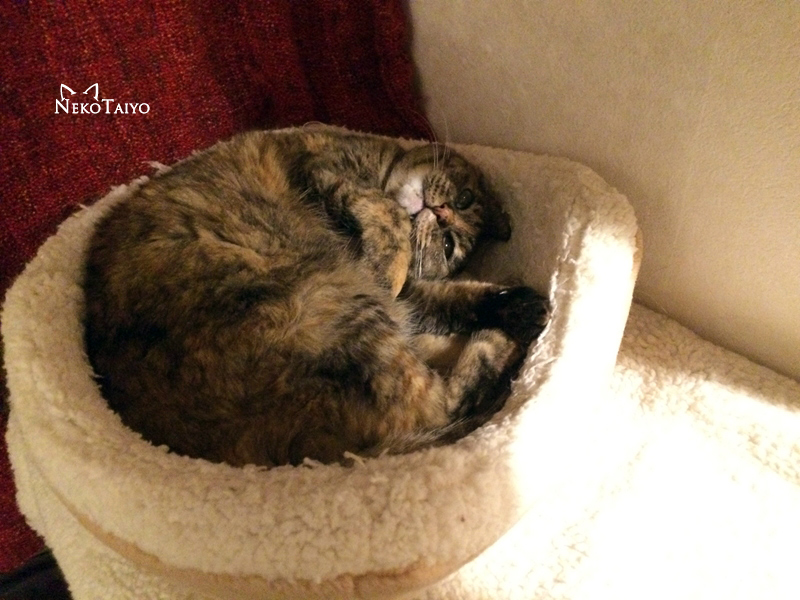ロハコの箱に入った半分マカロンベッドに飽きたのかなぁ、と思ったら、ロフトにあるもう半分で丸くなっていたリン…