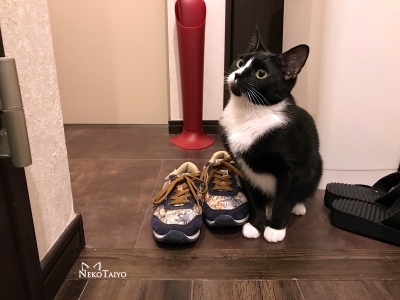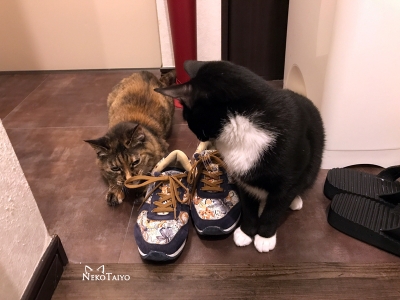 玄関で私のスニーカーを嗅ぐリンを不思議そうに見るユニ…