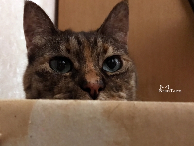 少し前に、何だかウロウロと落ち着かない感じだったので、デスクの下と猫階段の裏に箱を置いたらすっかり気に入って、入り浸ってます