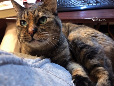 リンが膝の上で毛づくろい中、わざともぞもぞ動くと、こんな顔で見つめてきます…