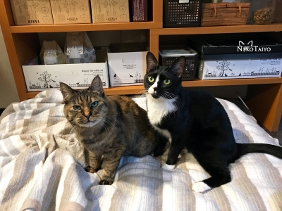電気敷毛布の上で、ちょっとだけ、モメてるリンとユニ…今日は早々に暖かい場所を分け合うという同意に達した模様