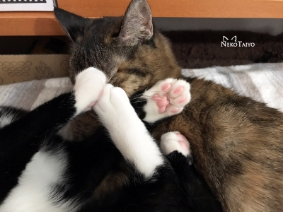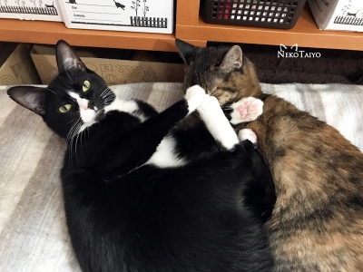 むぎゅぅ ユニ、リンの顔押さえるのやめて… リンも反撃したらどう? ユニの尻尾はだいぶ上がるようになってきたので、脱臼というわけではなさそう…根本から5センチ位のところに少し突起のような感触があるけど、骨なのか腫れなのか…昨日は触らせてくれなかったから、やっぱり痛かったんだろうな。