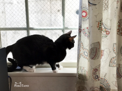 忙しそう 窓から見える隣の植え込みはすっかり葉が落ちて、鳥がいるのがよく見えたり、風のある日は何かが…何かはわからないけど…動いたりで、観察に忙しそうです ところで、ユニの尻尾…90くらいまで上がるようになってきました。根本から5センチ位のところが少し曲がってるので、まっすぐ上には上がらないようだけど、S字カーブを描いて…ちょっと優美? とにかく、もう痛くはないようです。