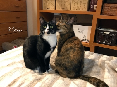 リンが頭を舐めてくれたので、ちょっとビックリしているのかもしれない…の図