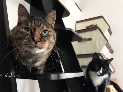 お一人様サイズの猫階段でくつろぐリンに忍び寄る怪獣…