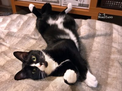 夜になって少し涼しかったりすると、まだ電気毛布の上で寝たいらしく…でも、ひょっとして暑い?って寝相