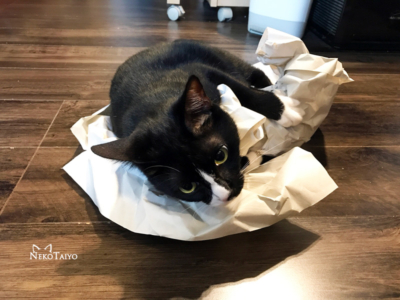 大きな紙と戦い…ストレス解消?しているユニ…昨日、リンが平気でベッドの上を歩いているのを見て安心したのかどうか、昨夜はベッドで一緒に寝てくれたユニでちょっと安心