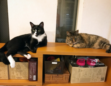 蒸し暑いので棚の上が人気…棚の後ろの窓を開けると、ユニは開閉ハンドルに少しビビる…