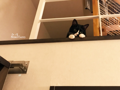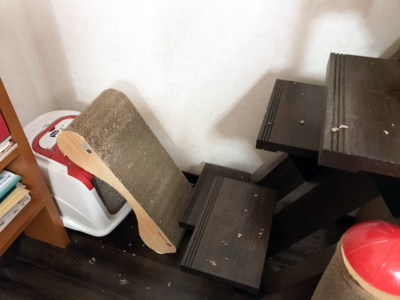 爪とぎは階段の上に置いてあって、階段の一番上はわずかに段差があるので勝手に滑り落ちることはないし、ユニが蹴り飛ばしたのか投げ飛ばしたのか…