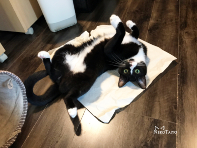 床に何かあれば、それに乗るのが猫…