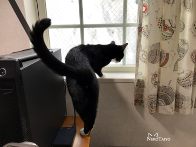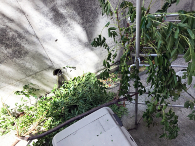 昨日の強風で外スペースに落ちてきた枝…なんか急に木が生えたみたいになってるから気になるみたい…