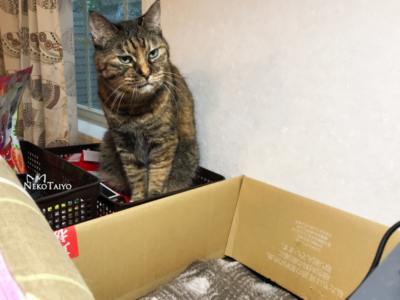 箱に入って寝る前に、なぜかプリント用紙の上にしばら~く座ってるリン…何を考えているのやら