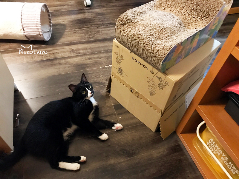 閉じ込め中 閉じ込めているのは箱の中のゴキ…殺虫剤でおくたばりいただく間、ユニが突っつかないように…ユニはビビリなので、何が何でも箱の下に顔を突っ込もうというほどのガッツはないので助かる 箱の中が静かになってから、ユニを台所に閉じ込めてゴキを片付け…ようやく何があったか忘れた頃 ちなみに、リンはずっと寝てました。