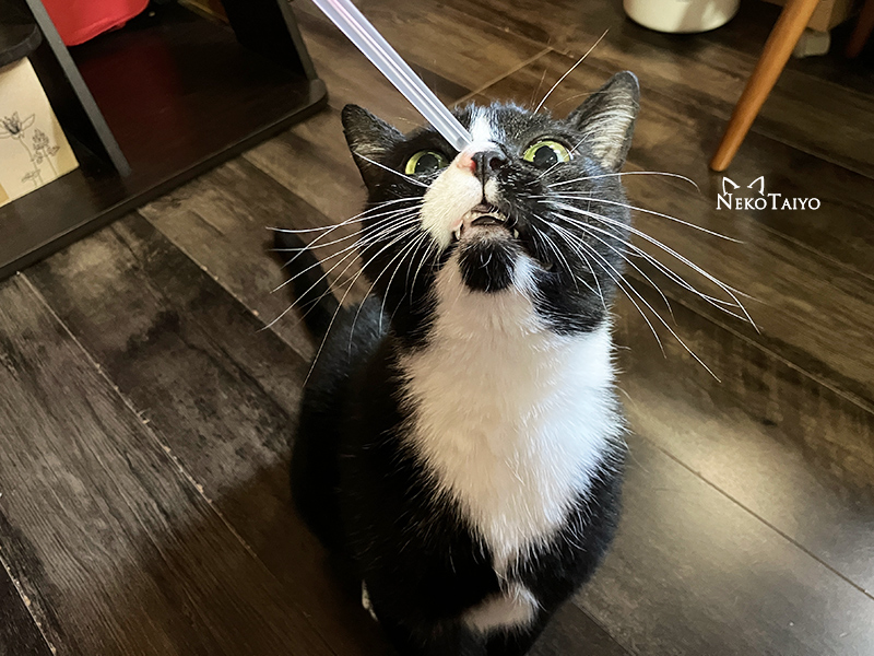 猫は先っちょを嗅ぐ…ちょっと口が開く…