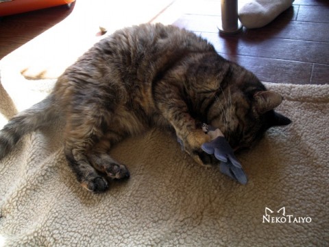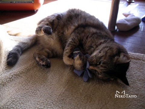 マタタビを入れた靴下を抱えて