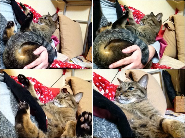 iphone4S で撮影 昔は、「抱っこ!」と要求しても、ひとしきりゴロゴロ言ったら気がすんで「もういいわ!」と飛び出していったものだけど、この頃はいつまででも抱っこされてます