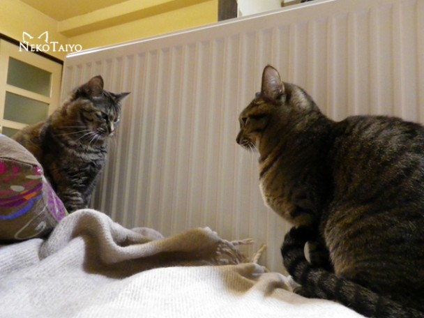 ココとリン、ヒーターの温もりを分かち合っている、はず