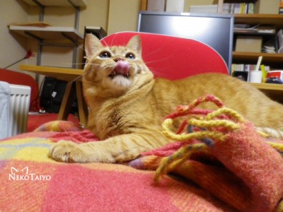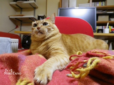 椅子+低反発枕+膝掛けの上に、自ら盛られたノイ。ひげで何かを捕まえようとしています