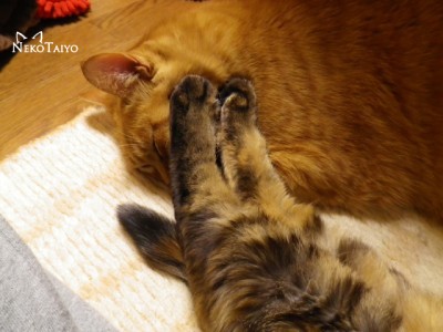 ムギュゥッ ホットカーペットの上で寝ているノイと私の間に入ってきたリンを、撫で撫でしていると、ゴロン、伸び~、蹴り~ というわけで、ノイ、完璧にムギュゥッと顔を押されてますが、爆睡中につき微動だにせず、なのでした それにしても、リンの足のカワイイこと