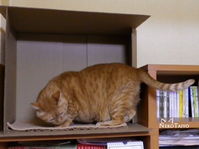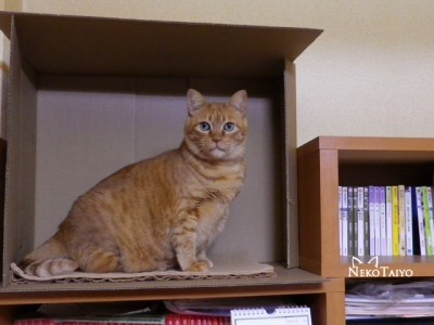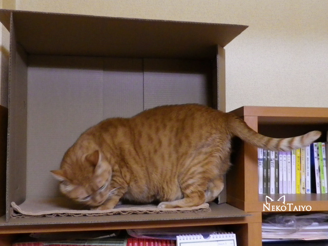 ノイに上下運動をさせようと、棚の上に行きやすいようにして、ダンボールなんか置いてみた…で、うまく術にはまってくれたのだけど :party: