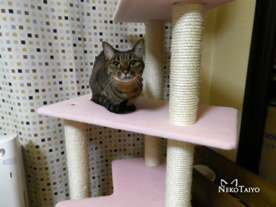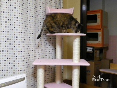 タワーがやって来た ついにキャットタワーを買った…夜7時過ぎに配達されて、早速組み立てて、まずはココが乗り心地チェック…なぜか中段 そしてリンが匂いチェック…まぁ、安い家具によくあるような匂いがするし、今のところ、あまり興味がなさそうだけど、明日になって「外がよく見える」と気づけば…と期待