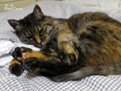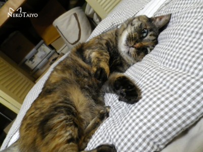 暖かくなって、寝る時に掛けるものが減ったので、昼間はたたんだ夏布団の上でゴキゲンだったりします