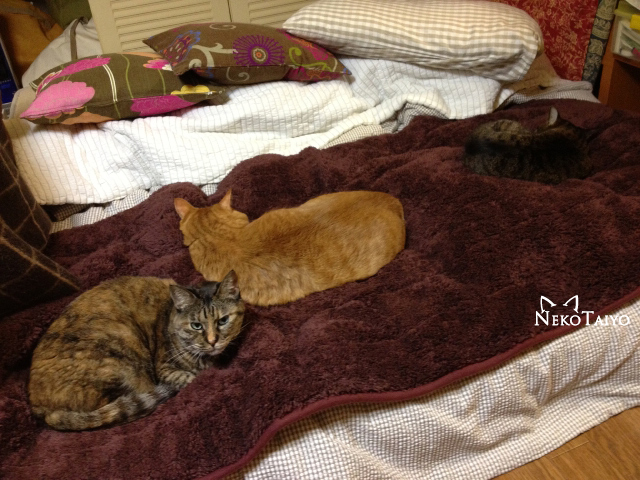 ホカペに集合 これだけ広ければ、仲良くなくたって一緒に寝れる!ということで、ホカペに全員集合 普通の床に敷くホカペだとあまり柔らかくないから、けっこう温度上げてないと気づいてくれなかったりするけれど、これなら、布団の上に敷けばフカフカやし ノイリンはけっこう仲良しっぽく寝てます