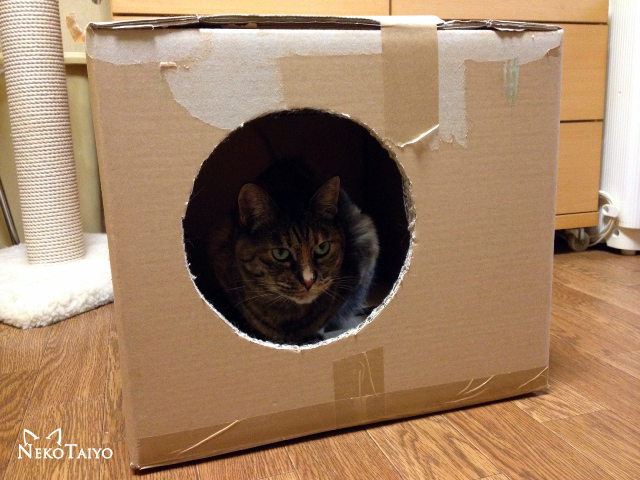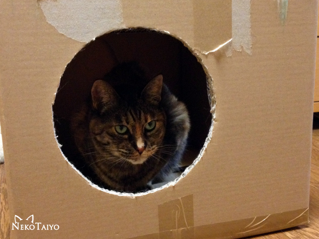 中に潜む時はもっと小さい箱に入っているけれど、この箱には一時待機的によく入ってます。やっぱり、4方向に窓穴を開けたのは多すぎたかも…