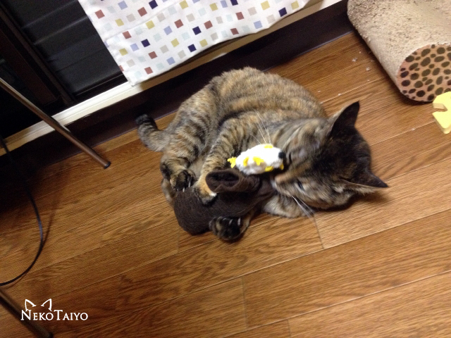 キャットニップを仕込んだオモチャと戯れるリン…ガッシリ掴んで