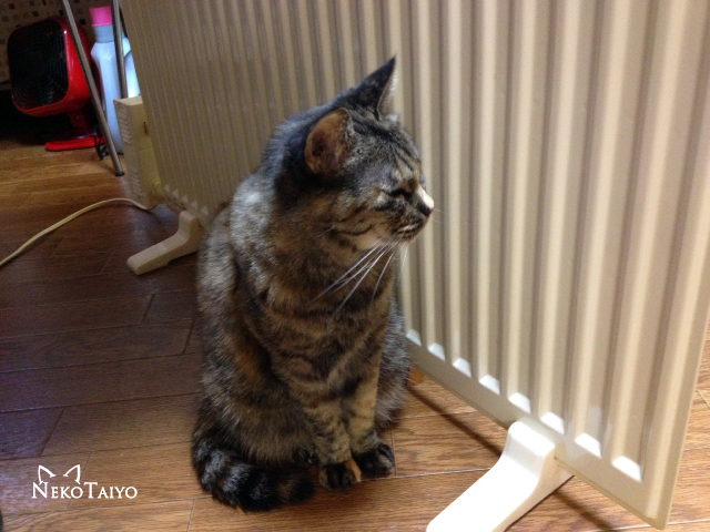 なんだか寒いので、ヒーターをテーブルの下に移動させたら、リンがもれなく着いて来て…